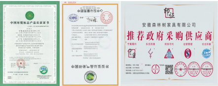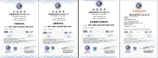 2019年,“森林树” 家具通过了1S090001、IS014001质量环境管理体系认证: GB/T 2800- -2011职业健康安全管理体系认证: