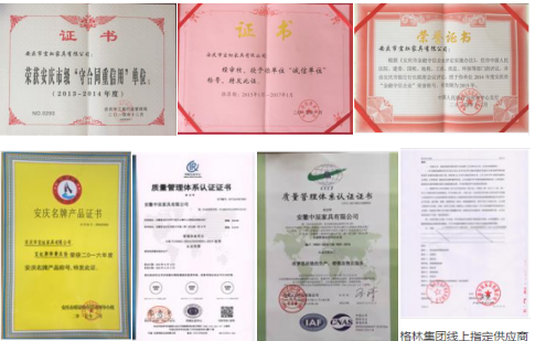 公司连续15年获得:皖西南产品质量技术监督检验中心抽检合格产品;连续4年获得:安徽省质量技术监督研究院抽检合格产品。