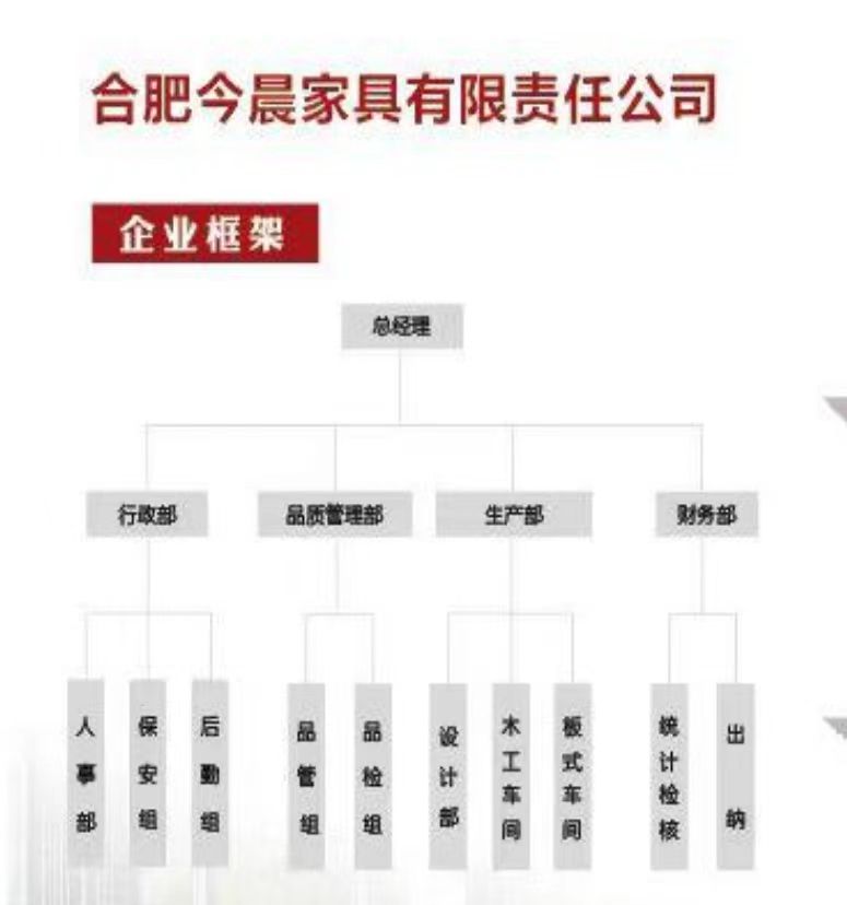 合肥今晨家具有限责任公司位于合肥市佳海工业园A区,是一家集生活家具及办公家具设计,生产、销售于一体的现代化企业。总公司生产面积一万余平方米,拥有多条专业化生产流水线,产品覆盖实木经典,板式现代、软体工艺、铁艺工业等多个系列,数百种款式,家具配套完善、功能完备,可满足高品质办公家具,酒店工程及会所等配套需求。自公司成立以来,一直本着以人为本、精益求精的专业精神不断开拓,现拥有企业员工逾36人,各类专业设备10台套,其中大型进口设备5余台套。