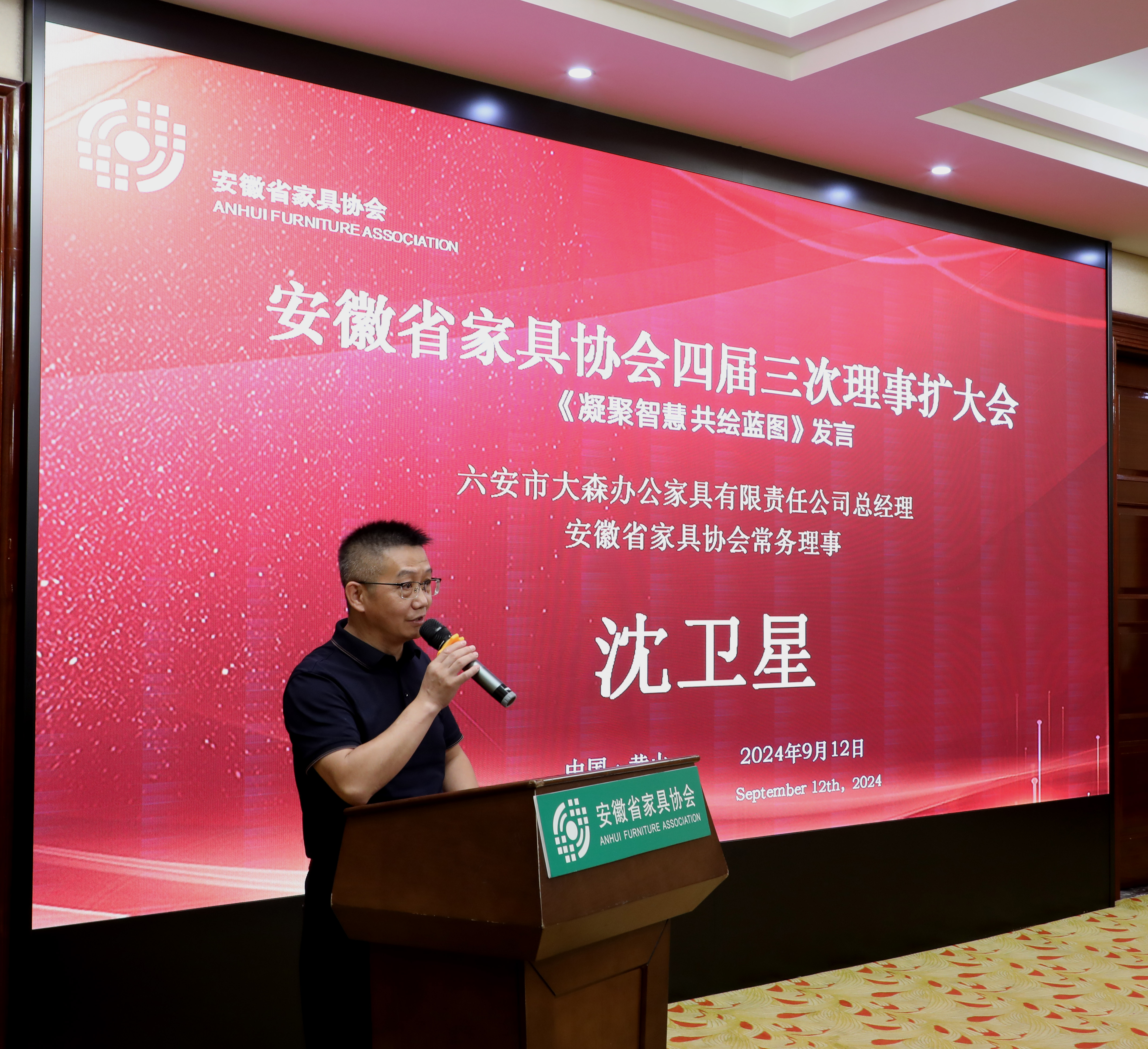 六安市大森家具销售有限公司总经理沈卫星作为专家委员会办公家具专家,发表了感言,强调了专家库在行业发展中的重要性,并呼吁各位专家积极参与专家库的建设,共同推动安徽家具行业的繁荣发展。