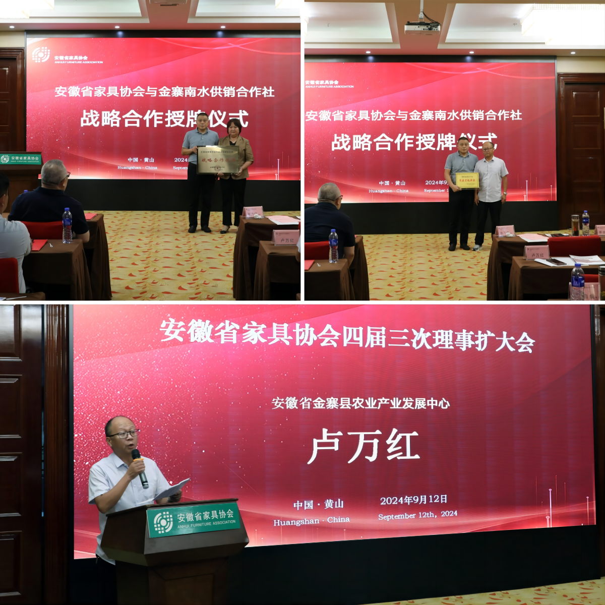 会议的第二部分,金寨县政府、农村农业局作金寨特产推介,金寨县农业产业发展中心主任卢万红、金寨南水供销合作社总经理吴彩虹分别为安徽省家具协会授予帮销金寨农产品突出贡献单位、金寨南水供销合作社战略合作伙伴的牌扁。