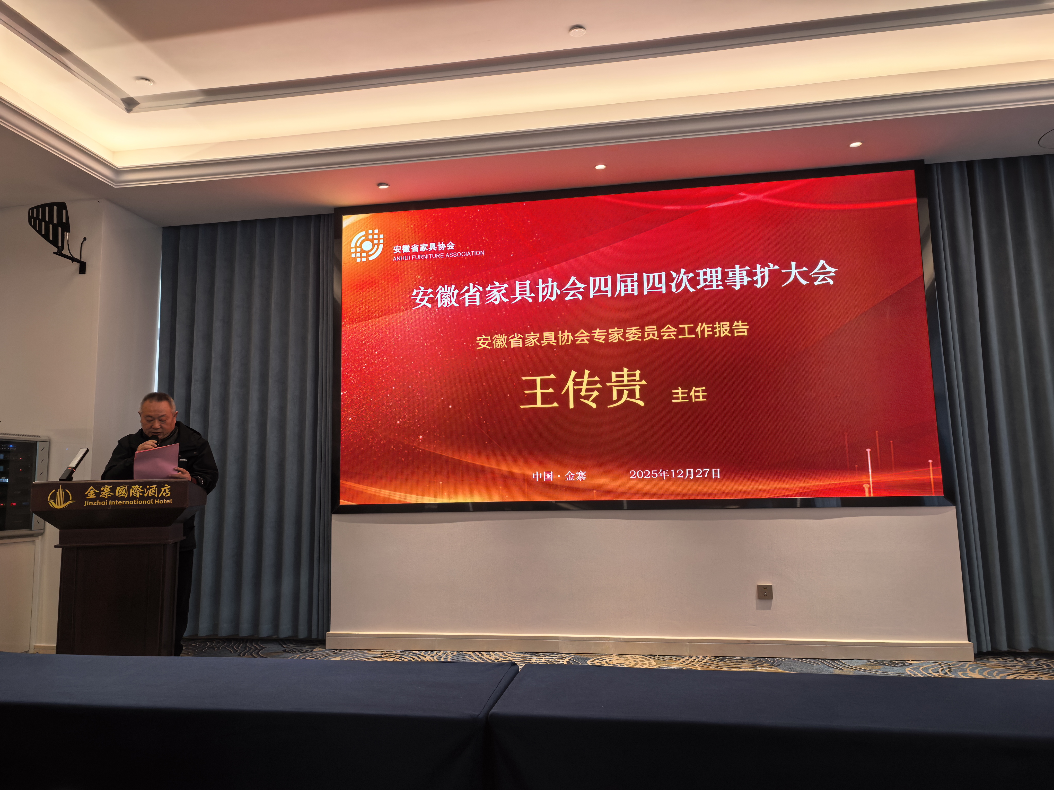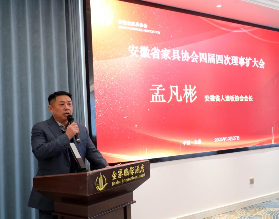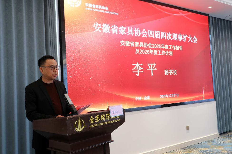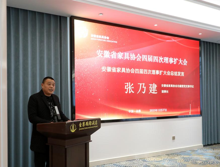 【概要描述】 擘画行业发展蓝图 安徽省家具协会四届四次理事扩大会议在金寨胜利召开 2025年12月27日至28日,安徽省家具协会四届四次理事扩大会在素有“红军摇篮、将军故乡”之称的六安市金寨县隆重举行并圆满落幕。在庄严的国歌声中,本次盛会正式拉开帷幕。会议旨在总结过去、谋划未来,凝聚行业共识,共商发展大计,来自全省家具产业链上下游的理事单位代表、会员单位代表、专家委员会成员及友好协会嘉宾等100多人齐聚一堂,涵盖80余家单位共同参与了这场年度盛会。参会代表合影 一、盛会启幕:群贤毕至,共襄盛举27日下午,会议在金寨国际酒店正式开幕。协会理事长张乃建、名誉会长赵卓华、秘书长李平、专家委员会主任王传贵等理事会领导出席大会。会议特邀安徽省人造板协会会长孟凡彬、安徽省家具经销商会秘书长王娟、金寨经济开发区商会秘书长胡秀英等友好协会领导莅临指导。中国家居报道主编段煜第到场参会并全程直播。会议伊始,主持人代表协会对全体与会代表的到来表示热烈欢迎,并逐一介绍了到场的主要领导与嘉宾。本次会议得到行业广泛关注,合肥市公共关系协会专门发来贺信,对大会的召开表示热烈祝贺,并对协会长期以来推动产业升级、服务会员企业的工作给予了高度评价。会议现场 二、审议与规划:总结成果,擘画未来会议首先听取了秘书长李平代表第四届理事会所作的《2025年度工作报告及2026年度工作计划》。报告系统回顾了协会在过去一年中,在强化政治引领、深化会员服务、拓展行业交流、精准建言献策、创新搭建集采平台等方面取得的扎实成效,特别是实现了集采平台出口业务的“零的突破”。报告也客观分析了当前行业面临的挑战,并围绕高质量发展主线,从深化党建学习、丰富活动载体、精准调研建言、促进合作联谊、优化会员结构、拓宽海外视野、加强内部建设等七个方面,提出了2026年的重点工作计划。报告内容详实,方向明确,获得了与会代表的一致审议通过。 安徽省家具协会秘书长李平 三、新生力量与行业荣耀:增补授牌与表彰先进根据协会章程和发展需要,会议审议并通过了增补第四届理事会成员的议案。本次共为8家新晋单位授牌,其中包括安徽红象人造板有限公司、六安市耀东华装饰材料科技有限公司2家副理事长单位,安徽峰之杰家居用品有限公司、上海思弘迅汇国际货运代理有限公司2家常务理事单位,以及六安市豪雅木业有限公司、安徽杵天君汇科技有限公司、安徽省信质检测技术有限公司、安徽汇晶教育装备集团有限公司4家理事单位。新力量的加入,为协会注入了新的活力。新增理事会单位授牌 接下来,隆重的表彰环节将会议推向高潮。大会为在过去一年中表现突出的42家会员单位颁发了2025年度“优秀会员单位”奖牌,并对专家委员会中做出卓越贡献的17位专家授予“卓越贡献奖”。张乃建理事长、孟凡彬会长等领导为获奖者颁奖,现场掌声不断,气氛热烈,充分彰显了行业崇尚先进、学习模范的良好氛围。 “优秀会员单位”授牌专家“卓越贡献奖”授牌 四、智慧分享与合作前瞻:领导寄语与专题交流安徽省人造板协会会长孟凡彬在嘉宾讲话中,热烈祝贺大会召开。他指出,家具与人造板产业是唇齿相依的上下游共同体,共同构成了从“一棵树”到“一个家”的完整链条。他高度赞赏了省家具协会发挥的平台作用,并表示愿与家具协会进一步深化协作,共同应对挑战,把握机遇,推动安徽家具产业繁荣发展。安徽省人造板协会会长孟凡彬 专家委员会主任王传贵教授汇报了专委会2025年在行业调研、技术指导、学术交流、团队建设等方面的工作,并提出了新一年的工作计划。专委会将继续推动行业专业化发展,为安徽家具产业的核心竞争力提升提供持续不断的专业动力。安徽省家具协会专家委员会主任王传贵 五、产业链联动与价值呈现:产品路演精准对接会议特别设置了三场产品路演环节,促进产业链上下游的直面沟通与合作。华杰图略科技有限公司作为板材供应商,分享了家具基材的创新技术与产品解决方案;上海思弘迅汇国际货运代理有限公司则聚焦国际物流,为家具企业“出海”提供了专业的货运通道与市场拓展支持。安徽峰之杰家居用品有限公司的代表也登台分享了其五金产品理念与特色,为与会者带来了更多元的产品与合作机遇,激发了与会者的合作灵感。产品介绍 协会理事长张乃建在总结发言中,首先向获奖单位和个人表示祝贺,并向友好协会的支持表示感谢。他充分肯定了协会2025年的工作成绩,继而立足全局,提出三点核心主张:一是胸怀大局,在高质量发展中找准绿色化、数字化、品牌化的新定位;二是务实深耕,在精准服务上实现新突破,尤其关注中小企业成长;三是开放协作,在生态共建中开创新格局,推动安徽家具产业从“集合”走向“共同体”。他特别强调,“独行快,众行远”,并结合自身企业已在新加坡、马来西亚成功开展业务的实践经验,号召全体会员企业积极放眼全球,大胆“走出去”,共同开拓更广阔的市场空间,为安徽家具产业提升国际竞争力注入新动能。他的讲话为全体会员统一了思想,凝聚了力量,指明了共同奋斗的方向。安徽省家具协会理事长张乃建 六、情谊交融与机遇共享:招待晚宴其乐融融当晚,协会在金寨国际酒店举办了招待