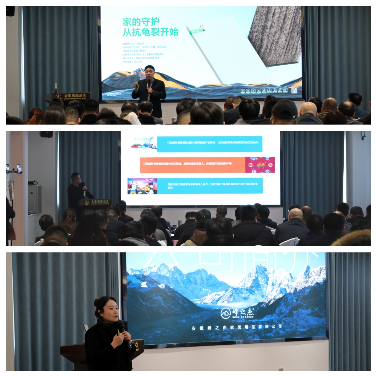 会议特别设置了三场产品路演环节,促进产业链上下游的直面沟通与合作。华杰图略科技有限公司作为板材供应商,分享了家具基材的创新技术与产品解决方案;上海思弘迅汇国际货运代理有限公司则聚焦国际物流,为家具企业“出海”提供了专业的货运通道与市场拓展支持。安徽峰之杰家居用品有限公司的代表也登台分享了其五金产品理念与特色,为与会者带来了更多元的产品与合作机遇,激发了与会者的合作灵感。