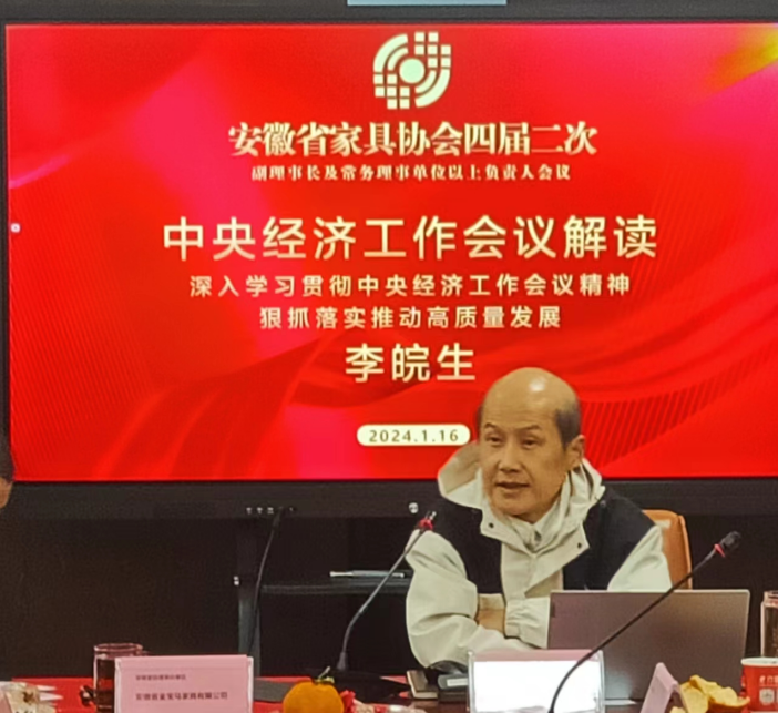 会议伊始,由中共安徽省社会组织委员会驻会党建指导员李皖生做中央经济工作会议解读报告,他从全面看待我国经济社会发展取得的进展成效、深化新时代做好经济工作的规律性认识、把握2024年中国经济发展的有利条件三个方面进行分析解读。 其后对安徽省家具协会各会员单位提出了要深化了解新时代做好经济工作规律性认识的建议,要认真把握2024年中国经济发展的有利条件,进一步打开国内宏观政策的自主空间,家具行业要继续为经济发展蕴育新机遇。