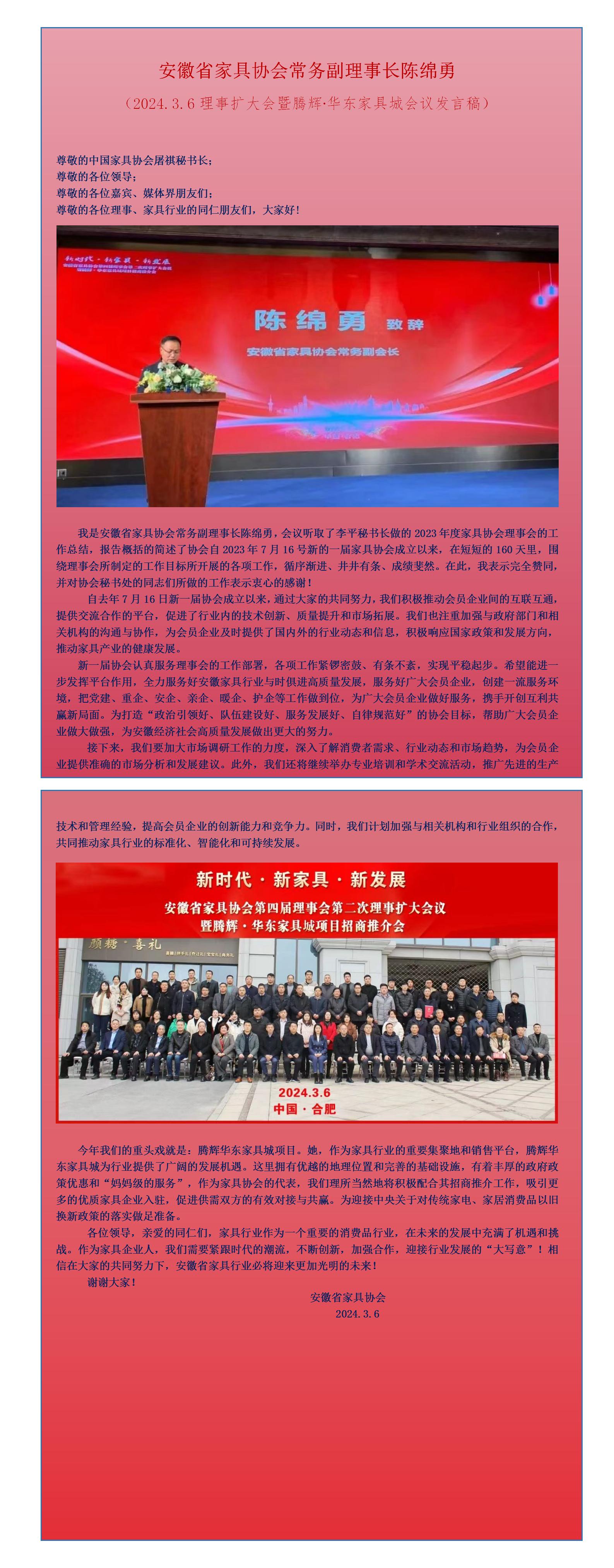 2024.3.6省家协常务副理事长陈绵勇在四届理事会第二次理事扩大会暨腾辉·华东家具城项目招商推介会讲话