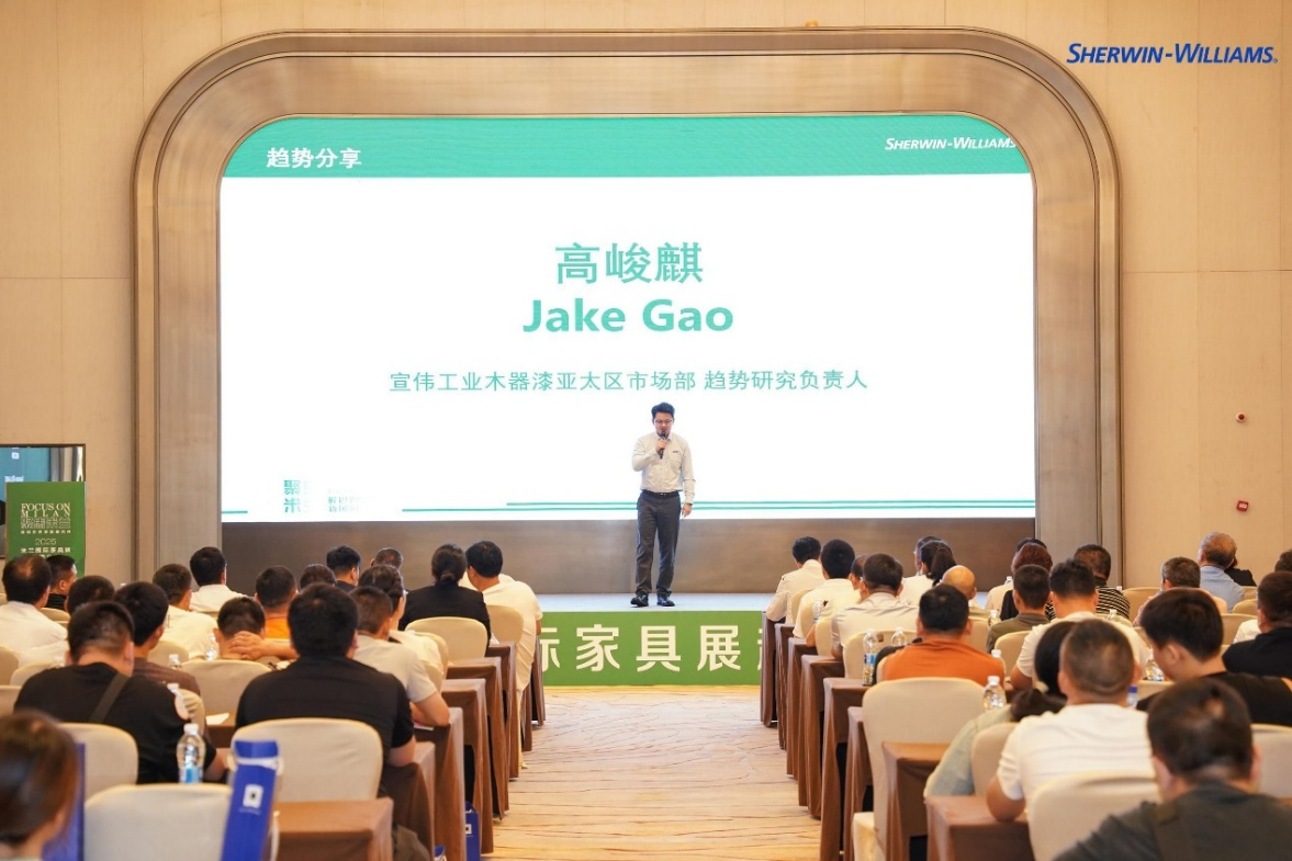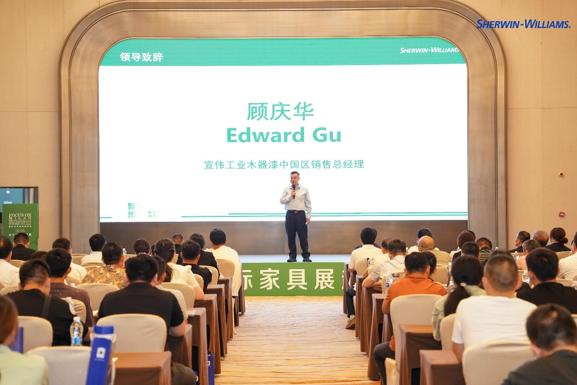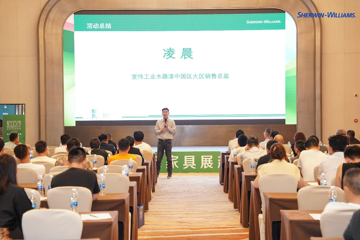 宣伟涂料成立于1886年,是全球涂装行业的领军企业,产品远销120多个国家。凭借158年的技术积淀,宣伟在环保涂料、智能涂装等领域拥有成熟的经验和解决方案。宣伟工业木器漆中国区销售总经理顾庆华在致辞中表示,安徽省是中国的家具大省,产业基础雄厚,市场潜力巨大。宣伟将充分发挥技术和服务优势,助力安徽家具企业提升产品附加值,实现可持续发展。随后,宣伟工业木器漆亚太区市场部趋势研究负责人高峻麒对2025年米兰国际家具展的行业趋势进行了专业的解读,他分享了2025米兰展在设计、色彩、材料、涂装等技术方面的趋势,反映了全球家具行业对美学价值的最新追求。最后,宣伟工业木器漆中国区大区销售总监凌晨就如何与参会企业达成具体合作做了详细的讲解。