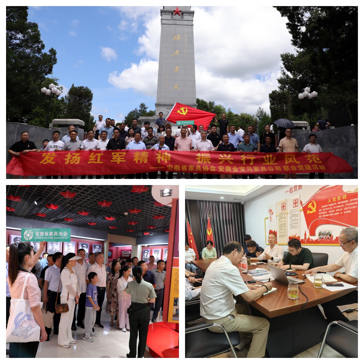 安徽省家具协会及理事长单位金宝马家具集团,组织全体党员走进金寨,开展红色文化之旅,参观红军纪念馆,发扬红军精神,传承红色基因。金宝马家具集团党支部牵头,组织成立了技术攻关小组,不定期开展“金点子”活动,结合实际工作交流心得,推动学用结合。