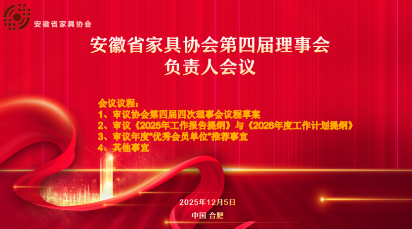 安徽省家具协会第四届四次理事大会定于2025年12月27日至28日举行,我们诚挚邀请各会员单位及相关企业积极报名参与,共襄盛会,共谋发展。
